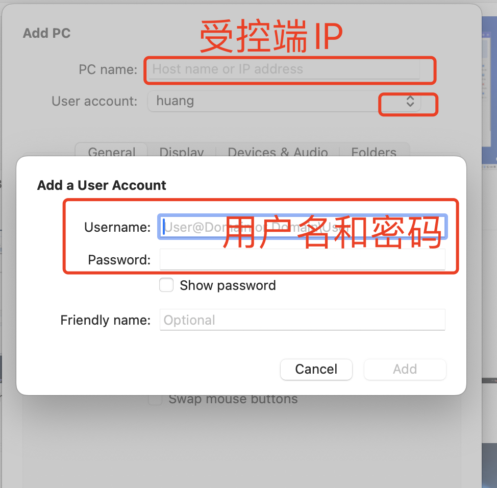 3、在Mac电脑上打开Microsoft Remote Desktop。点击左上角的+号按钮,选择添加PC。输入受控端IP、账号、密码。